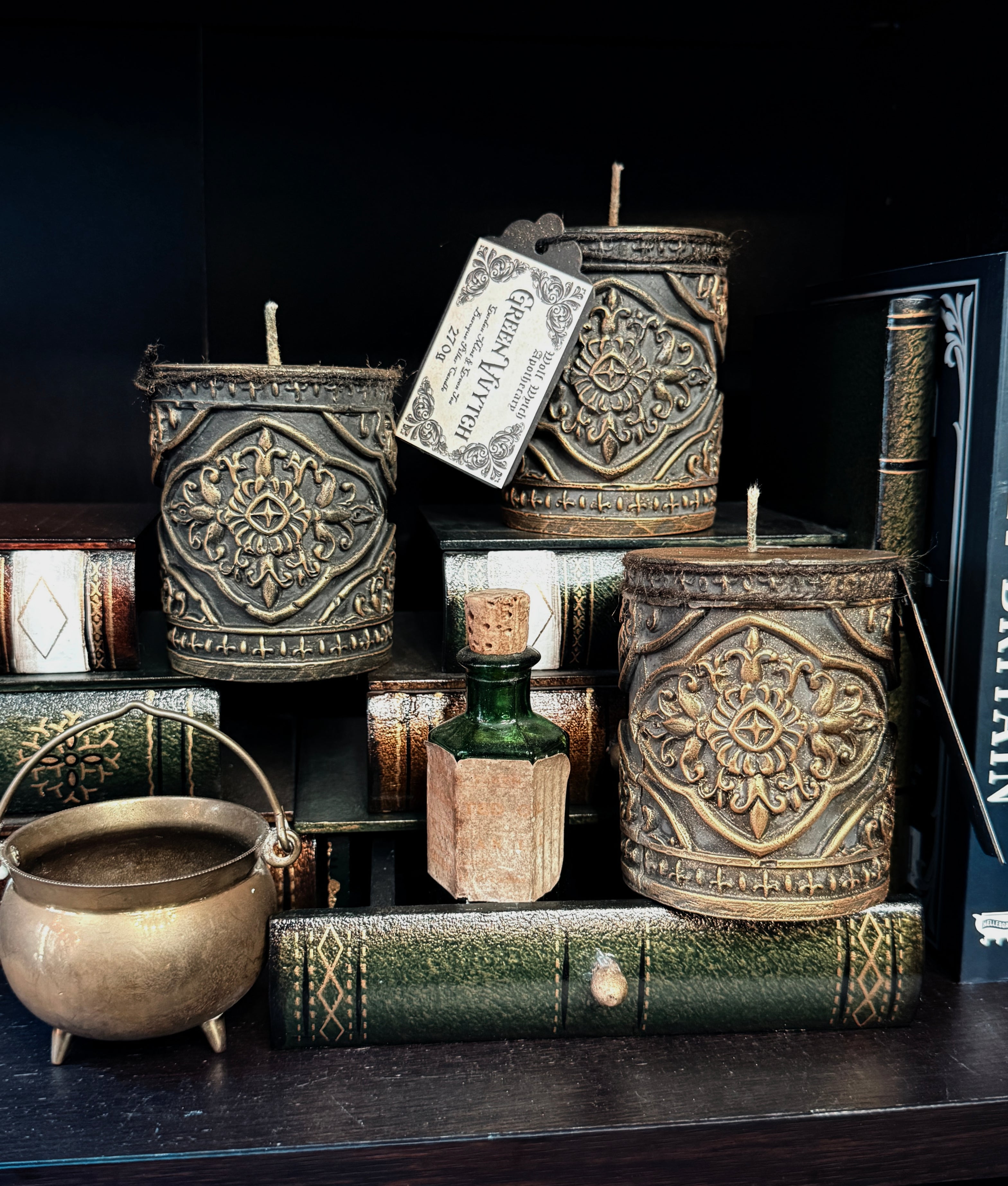 These candles come in sturdy matte black lidded boxes which also display an aged BP label and also a gold foil Wolf Wytch monogram on top.